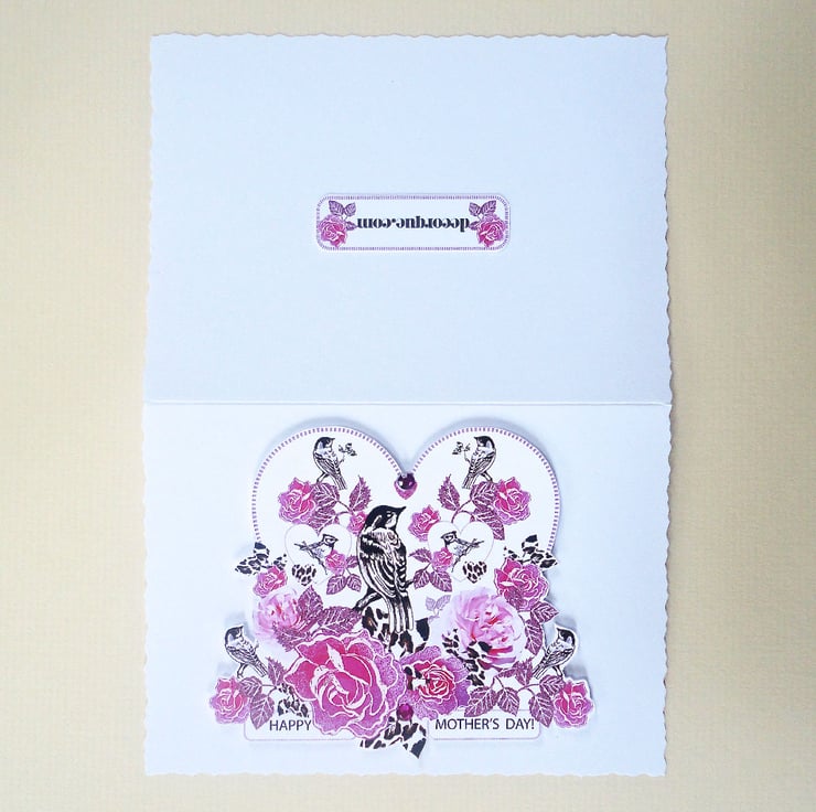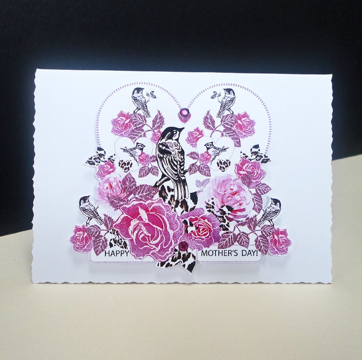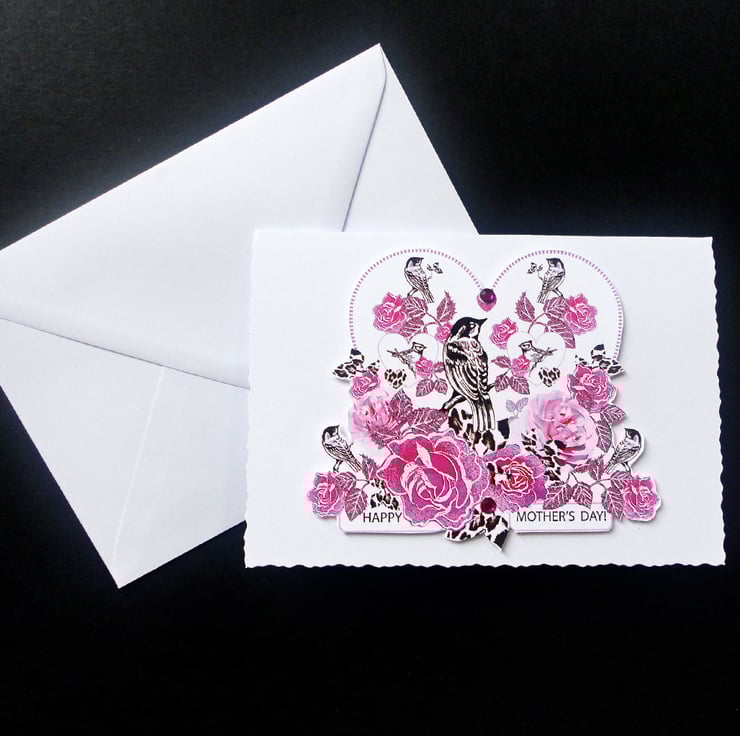 Small black and white birds are perched amongst clusters of pink roses and textured leaves inside a heart shape scene. at the base it says Happy Mother's Day. Hand drawn/painted and photographic images are used.