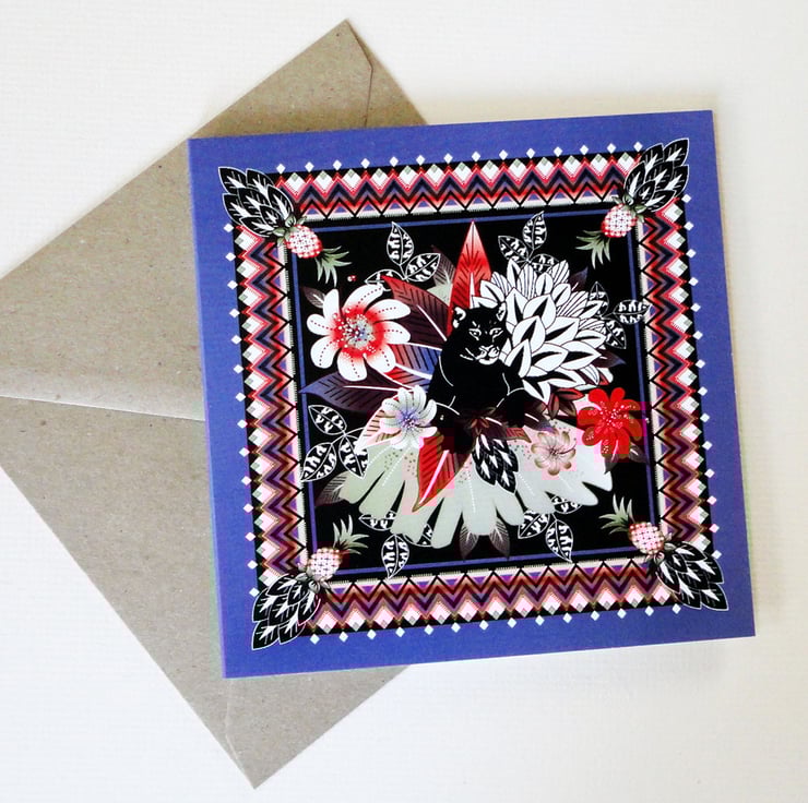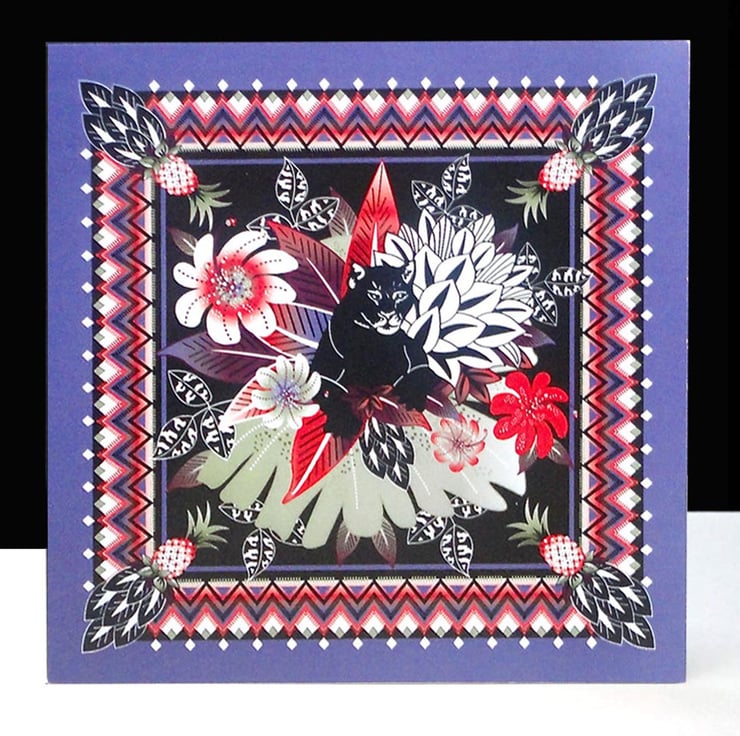 This exotic card has the elusive black panther sitting among tropical flowers and leaves set inside a vibrant zig-zag border, with corner pineapples and leaves in an aubergine frame. The complete design is created in Illustrator for a perfectly original detailed image.