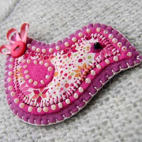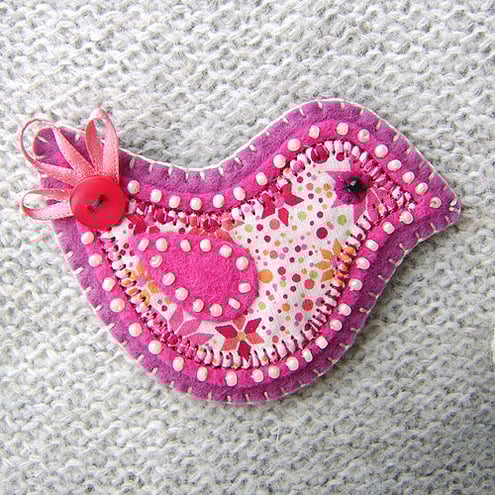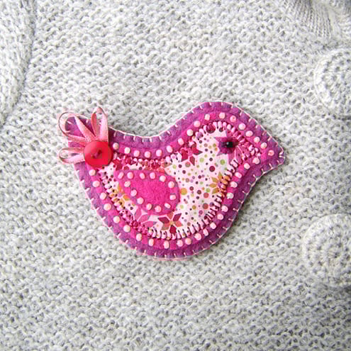 It features a little bird in Liberty fabric with beaded eye and pretty ribbon and button tail. It has been appliqued onto fuchsia felt and edged with cream beads. It is mounted onto a mulberry felt base and has a brooch backing for easy attachment.