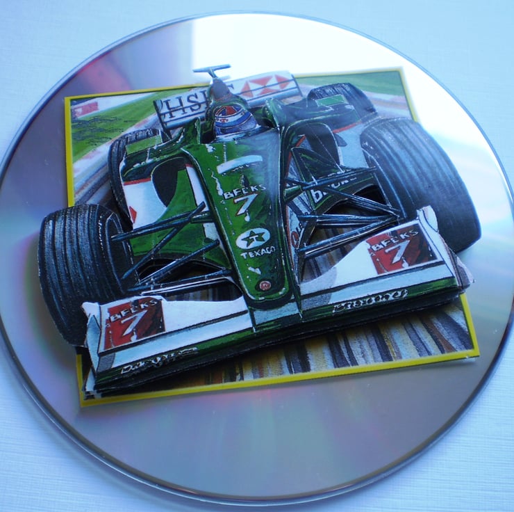 This is a cd with a decoupage /3Deffect racing gocart and would suit a boy and would look good on a wall or door using bluetack or stickyback fixers or on the small clear display stand shown in picture. To make it a little bit special I can put a name or any other greeting on it using peeloff stickers. The teddy bear picture is an example.