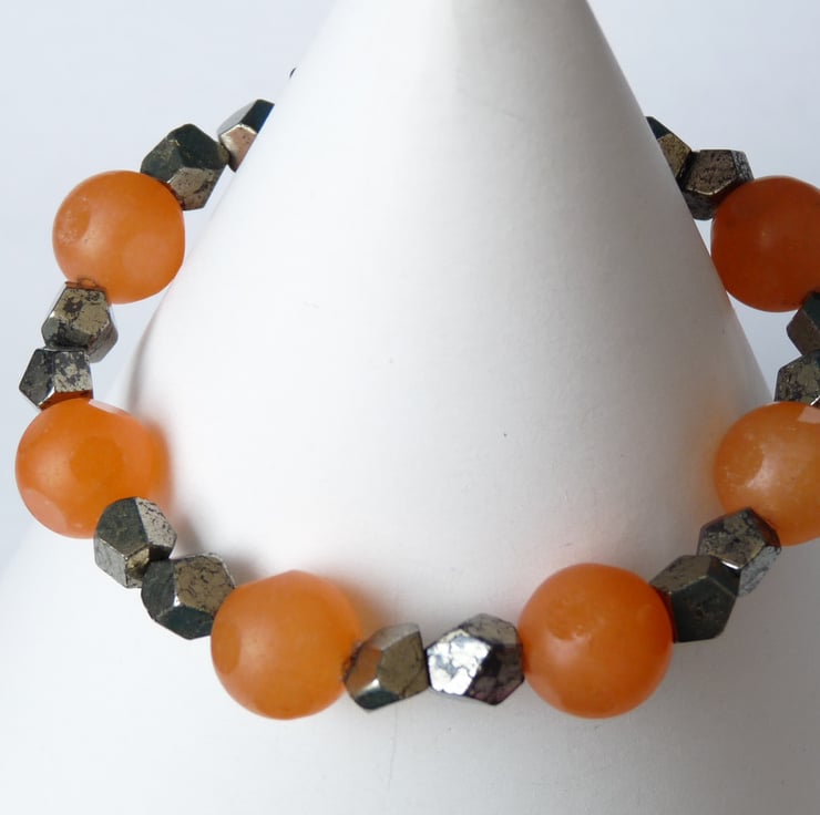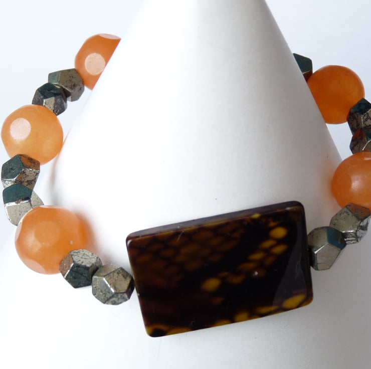 It is made with 10mm round frosted orange chinese quartize jade stones, approx 6mm rustic cut pyrite stones and a single 30 x 20mm printed shell rectangle.
