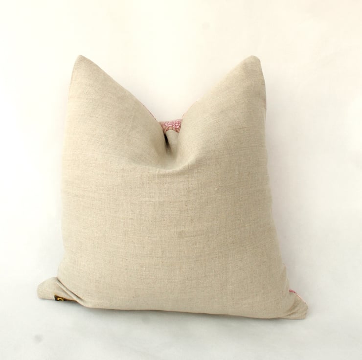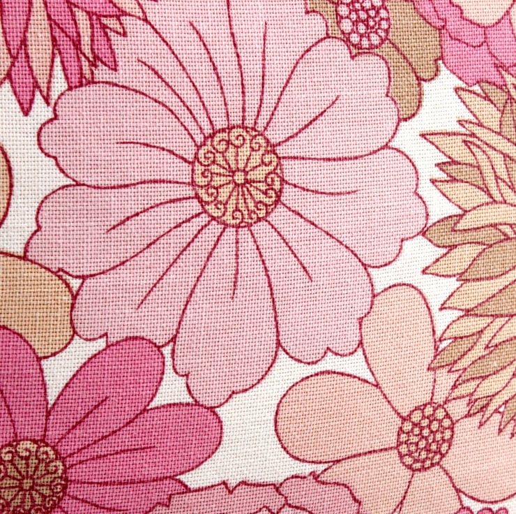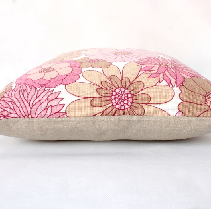 This is a vintage cushion that will cheer up any room. It is made using a lovely piece of vintage fabric, dating probably to the 1970s. This fabric is found only on the front of the cushion and it features large pink and brown peony flowers and daisies over a white background. It is in very good condition considering it is a vintage piece of material, being made of 100% loose weave cotton. The back of the cushion is made of a modern piece of good quality brown linen.