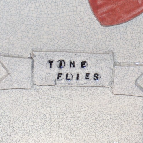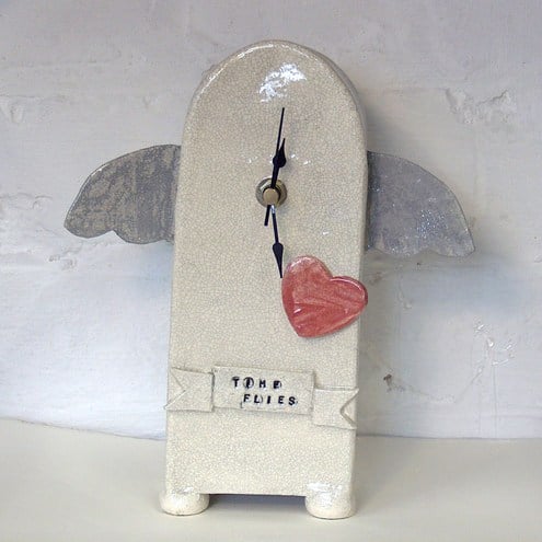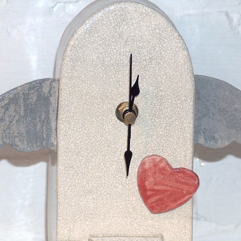 Handbuilt ceramic clock, with quartz mechanism. The clock has a banner reading, 'Time Flies'. The wings are in a grey underglaze and a little heart is attached for decoration. An AA battery wiil be included.