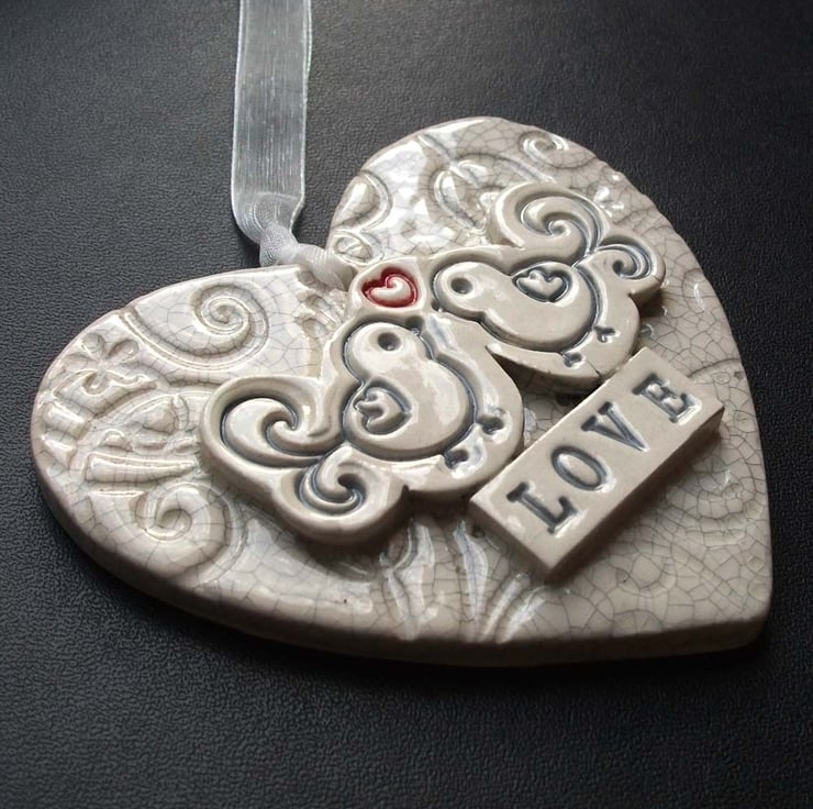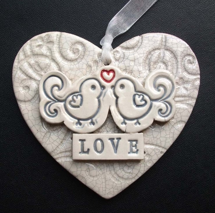 This ceramic heart is made from white earthenware clay and decorated with a lovebird motif.