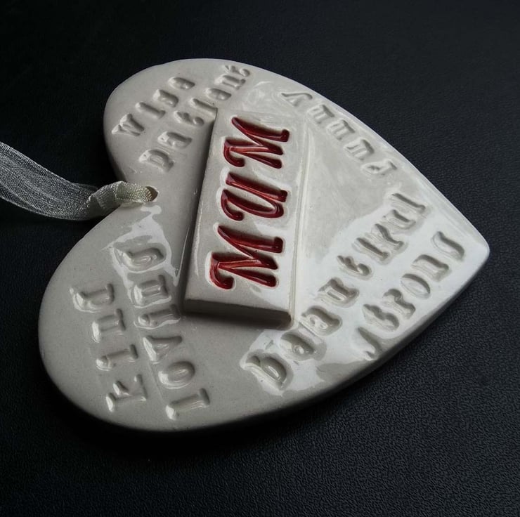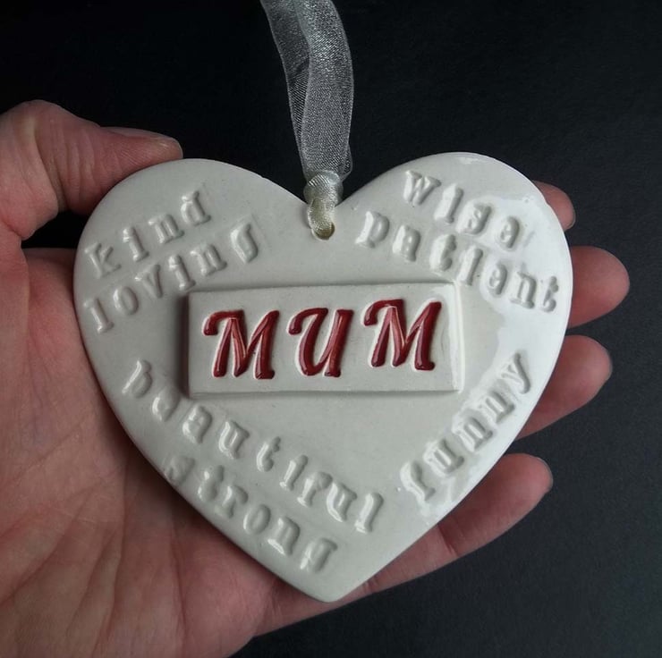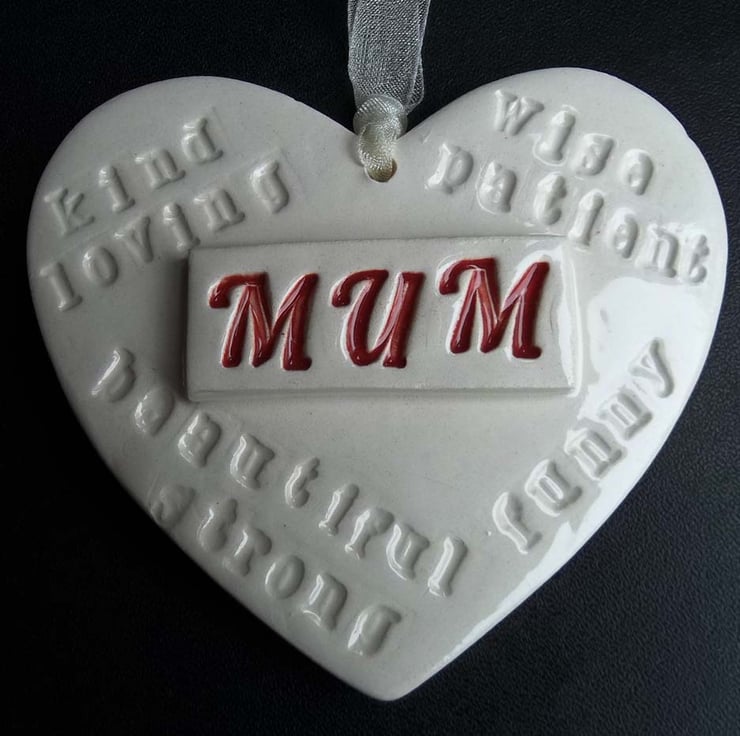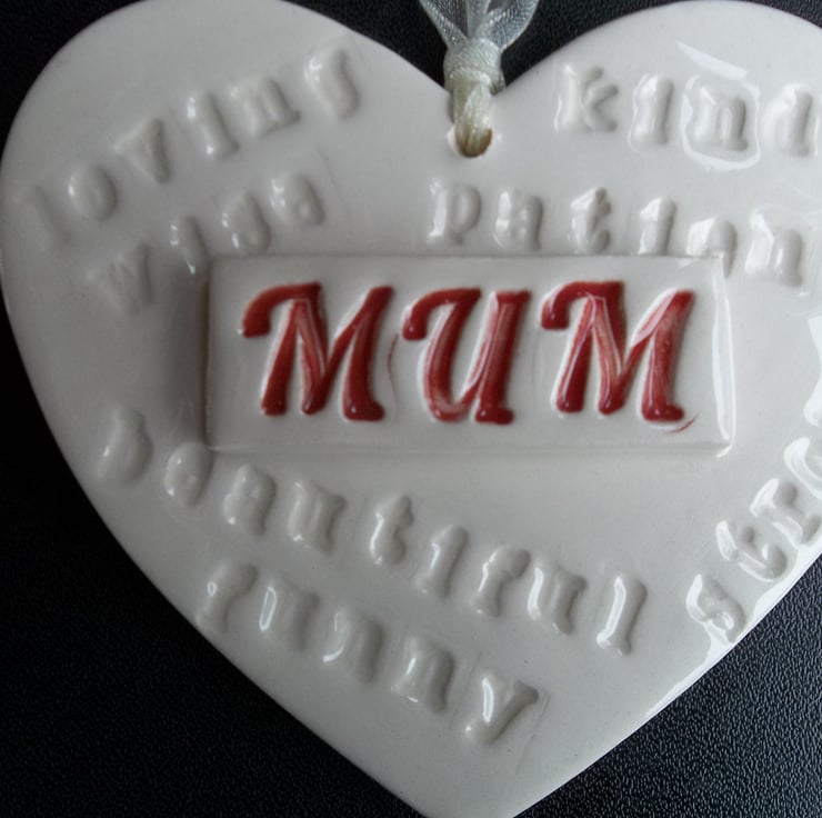 It is made from white earthenware clay, has the word Mum in the centre and is surrounded by words that describe all our Mums - kind, loving, wise, patient, beautiful, strong and funny"