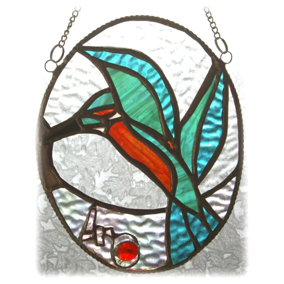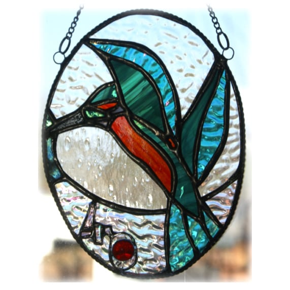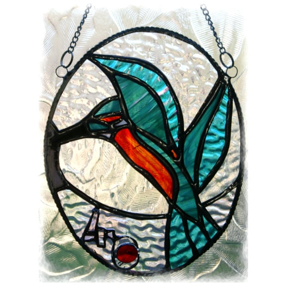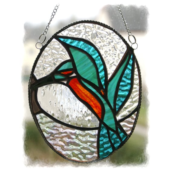 The suncatcher is in the form of an oval picture showing a bright shiny kingfisher. The bird has just flown up from the water with a fish in its beak.