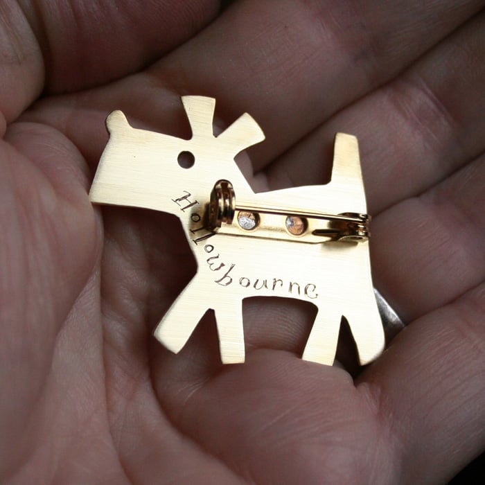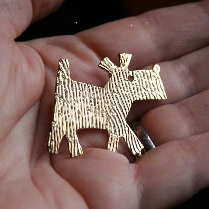 Brass dog brooch with a fingerprint like fur pattern. A type of scotty dog I think.