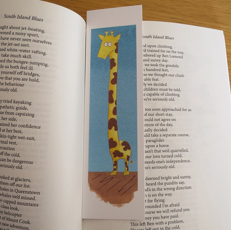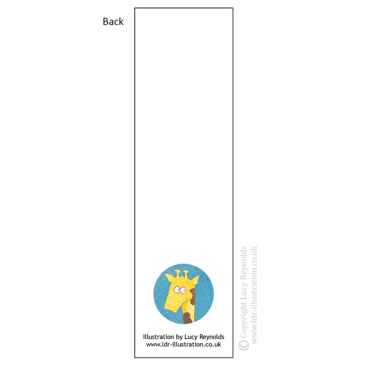 Illustrated giraffe bookmark. I painted the original illustration with watercolours. Each bookmark measures 52mm by 185mm and is printed on heavyweight silk card.