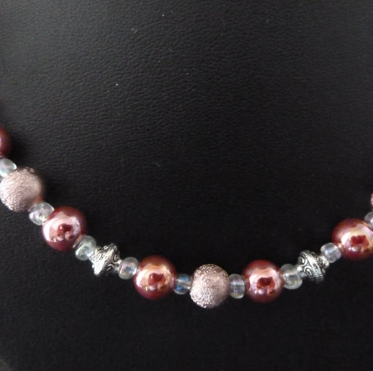 The necklace has been made using various pink beads with tibetan silver spacers. It fastens with a tibetan silver hook.