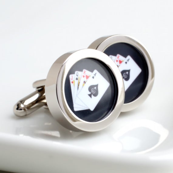 Hand of playing cards cufflinks featuring each of the four suits hearts, clubs, spades and diamonds and Jack, Queen, King and Ace.