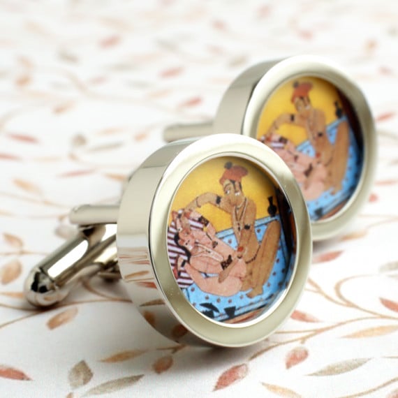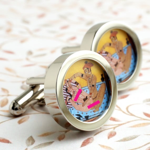 Erotic sensual cufflinks with one of the many positions demonstrated from the Kama Sutra.