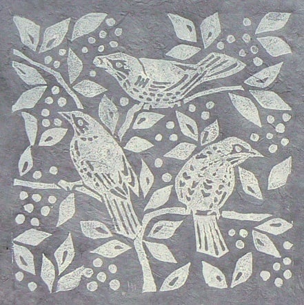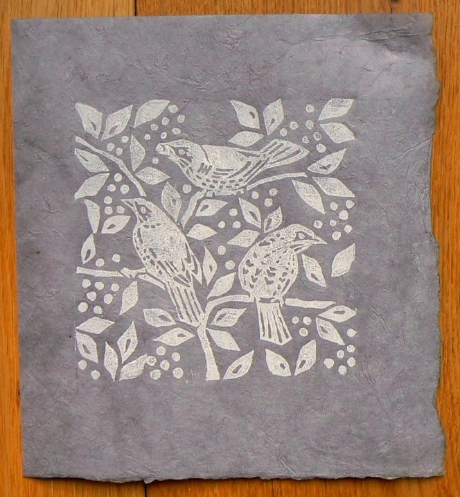 This version of the Fieldfares is hand printed in white ink, on hand made lokta paper, which is dyed a soft grey.