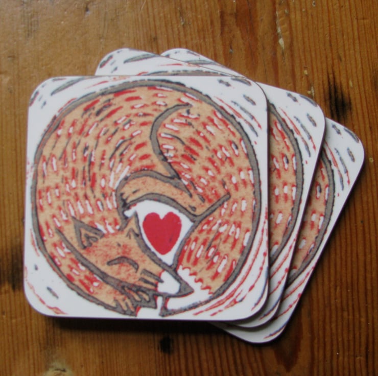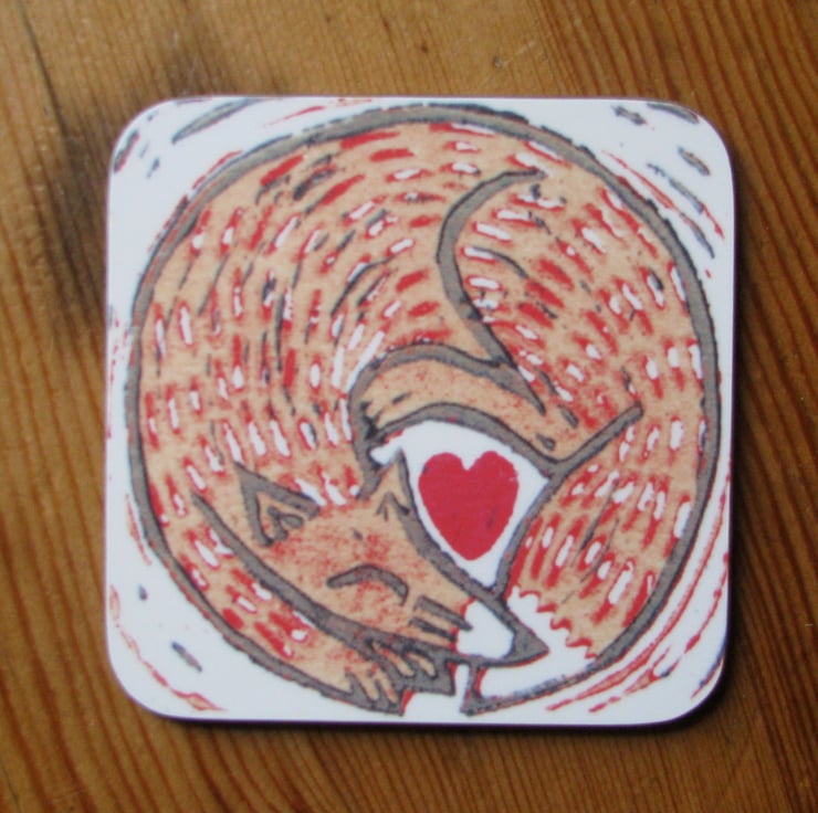 This adorable fox will wrap himself around your heart! Professionally printed, the coaster is based on an original linocut by BearPrintDesign. It is heat resistant with a high gloss finish and easy to wipe clean. Please take a look at the matching card and other coaster designs in my shop.