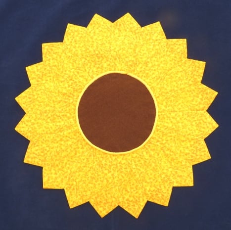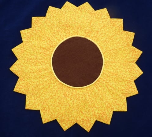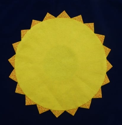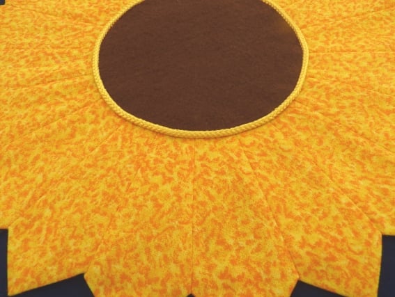 This lovely handmade Table Mat is made from a Yellow Fabric With a mottled pattern of Orange. In the center I have placed a circle of Brown felt to make the whole table mat look like a Sunflower. I have then hand sewn a round piece of Yellow Felt on the back to finish it of neatly. Its made up of 20 sections all sewn together to form this lovely mat which can be used in the center of a coffee table or dining table.