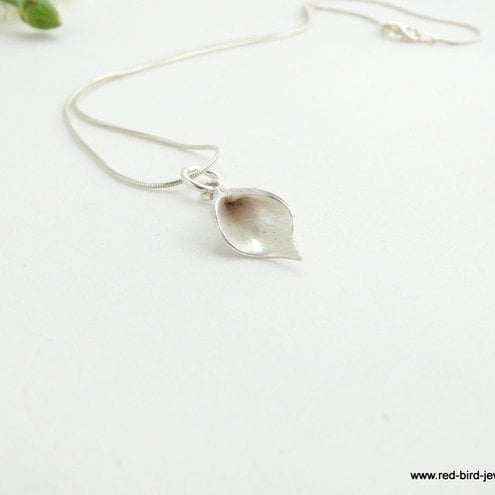 A sterling silver snake chain of 16 inches holds a handcrafted fine silver arum lily.