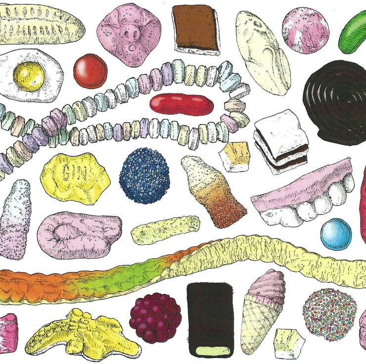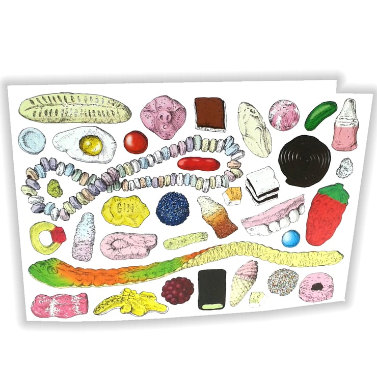 All your favourite childhood sweets put together on one card. Using illustrations by Simon Lewis, these detailed drawings have been coloured in digitally to give a bright and colourful visual reminder of all those childhood sweetshop memories. Suitable for anyone with a sweet tooth, it features all the best sweets, such as the cola bottle, fried egg, shrimp, banana, teeth, bubblegum bottle, wine gums, jelly bean, white mice........
