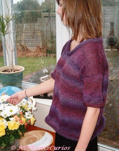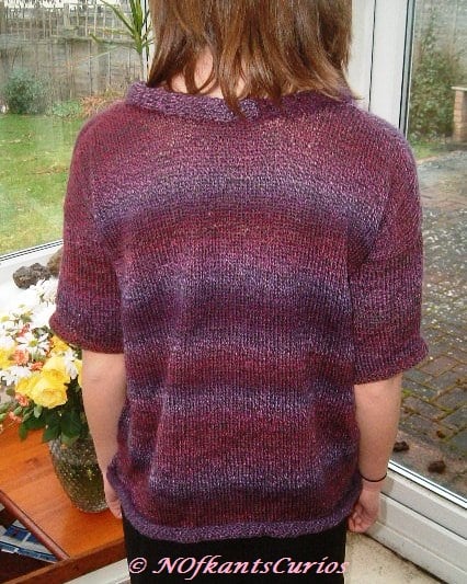 Purple Rainbow, Hand Knitted Petite Length jumper, with slim short sleeves and curl edging. A classic style and very practical, UK size approx 8 to 10.