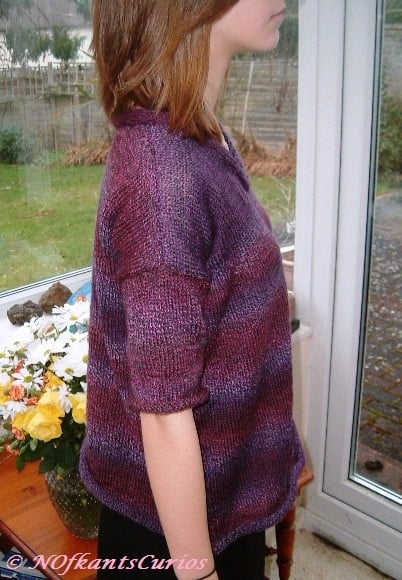 This jumper has been hand knitted in my own unique design, in Denys Brunton Designer yarn, a vibrant colour change 100% acrylic yarn, in lovely purples, pinks and mauves and trimmed in the same yarn.