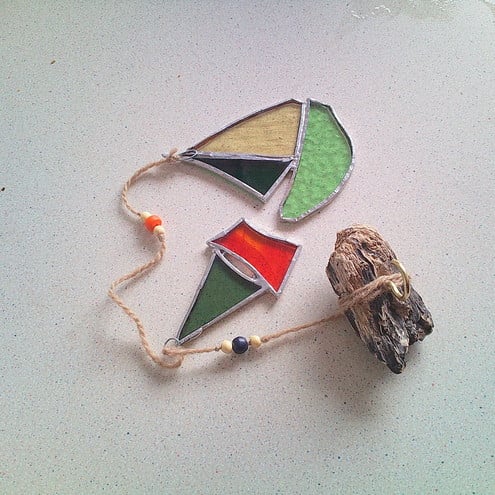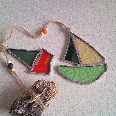 2 boat string of boats, in green, yellow and orange. with cream, blue and orange beads. Hung from a reclaimed brass hook, driftwood and wool.