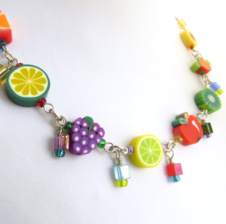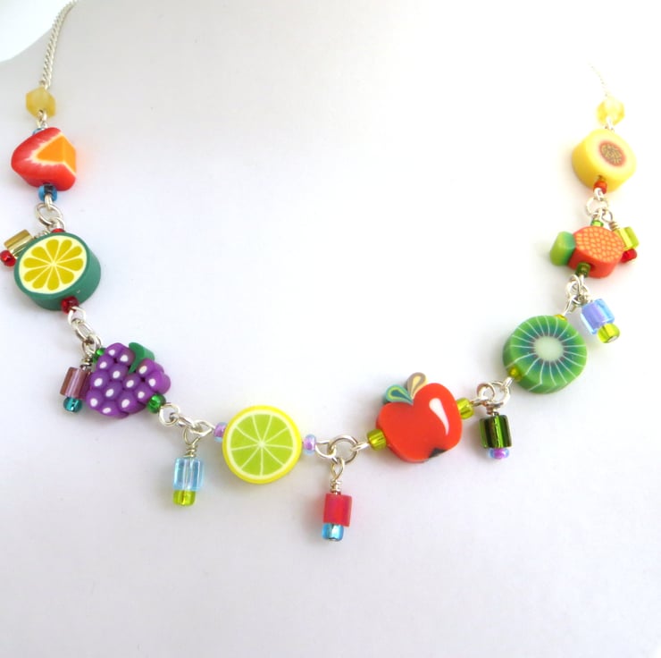 A cute necklace featuring miniature fimo fruit slices in a tropical array of colours, strung with contrasting bright seed beads and teeny glass cubes to give lovely extra detail and movement.