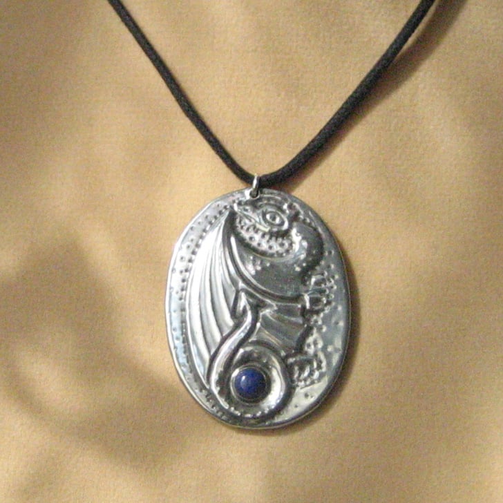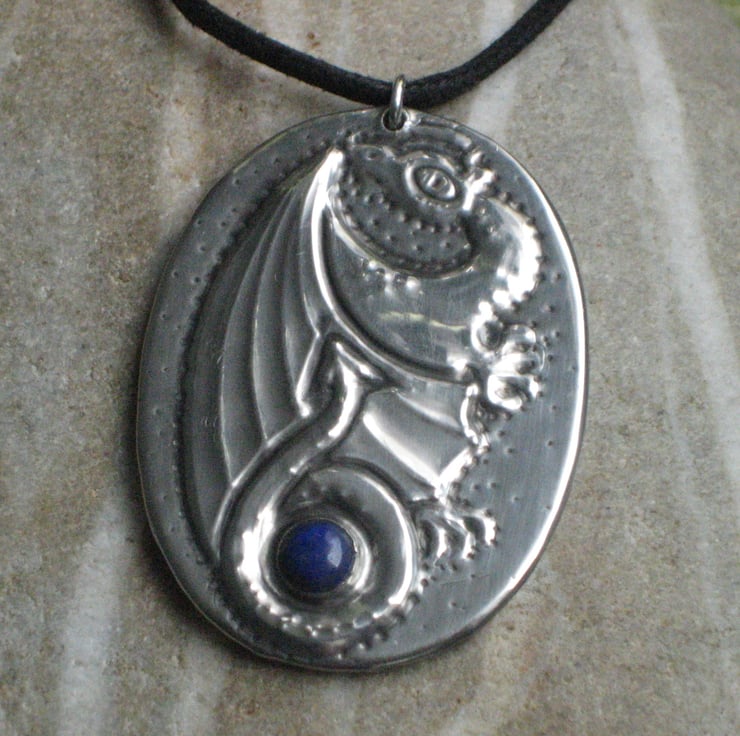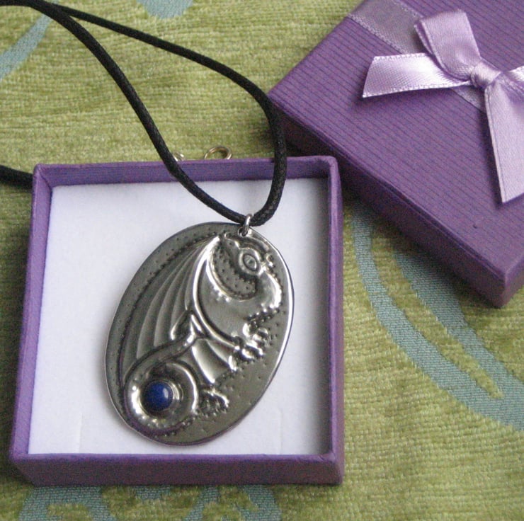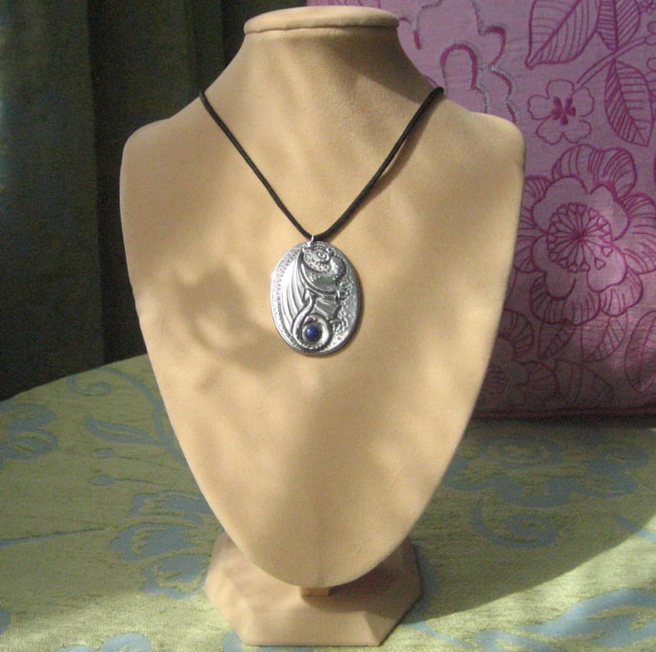 This pendant has been handmade in shiny modern pewter, and features a genuine lapis lazuli cabochon stone. It is suspended from a simple black fabric cord which is approximately 41cm long. The pendant measures 45mm x 34mm. Gift boxed (may differ from that shown). Please note that the display model is not lifesize.