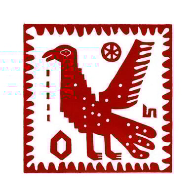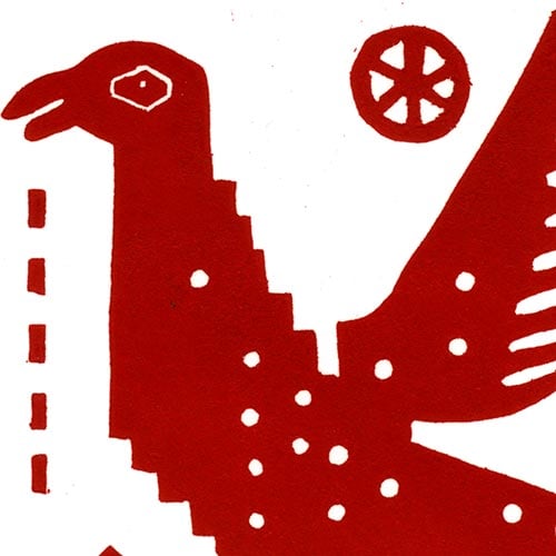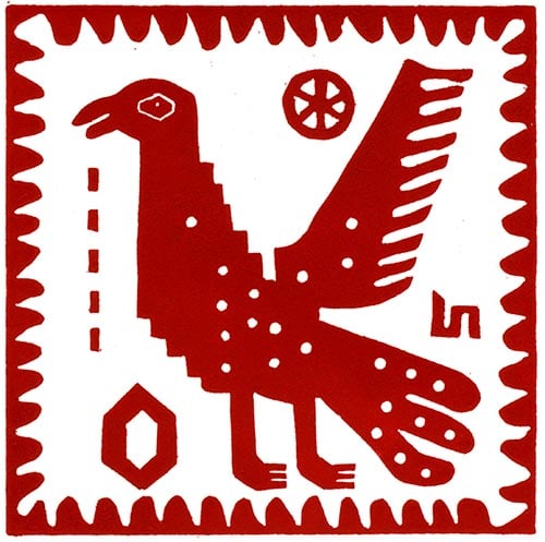 A linocut print featuring a large standing bird and symbols; this image is inspired by the designs and symbols on a Peruvian textile that I bought in the USA years ago.