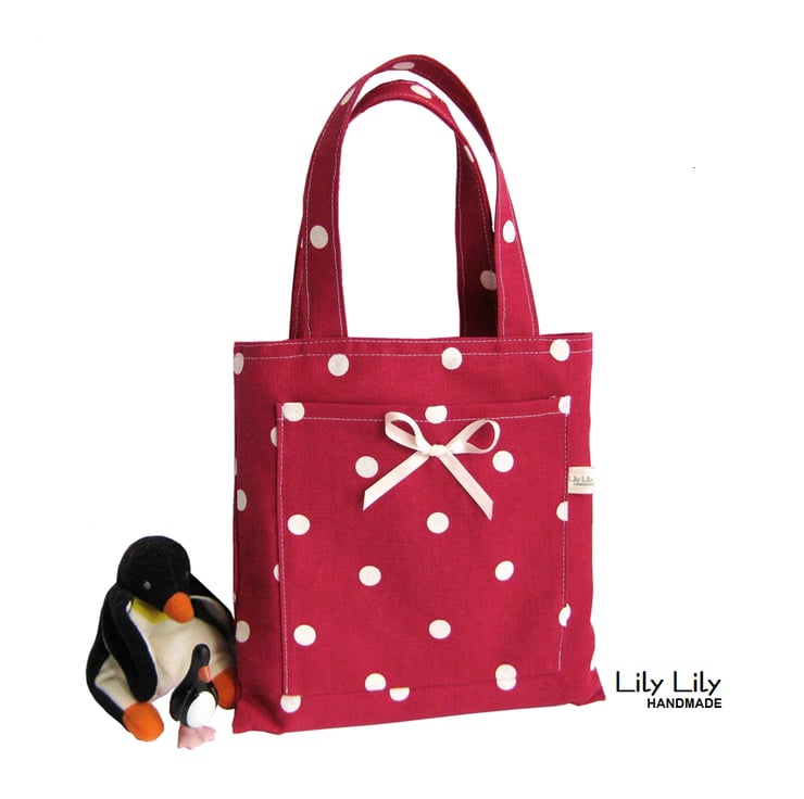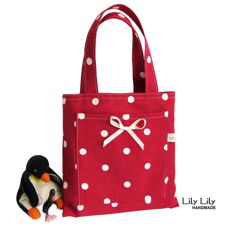 A cheerful red and white polka dot fabric small tote bag handmade by Lily Lily Handmade. A perfect gift for a young child to carry their favourite books, stickers, pencils and toys. The bag has a handy front pocket. Embellished with a pretty satin bow. Made using a quality medium weight fabric (100% cotton). Also ideal as a re-usable gift bag.