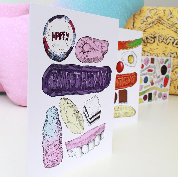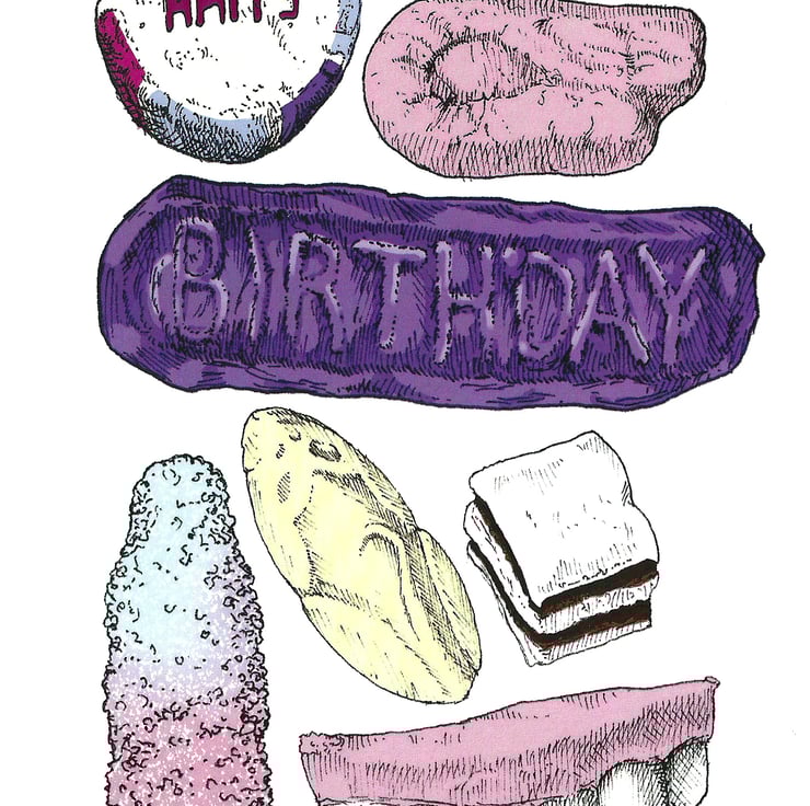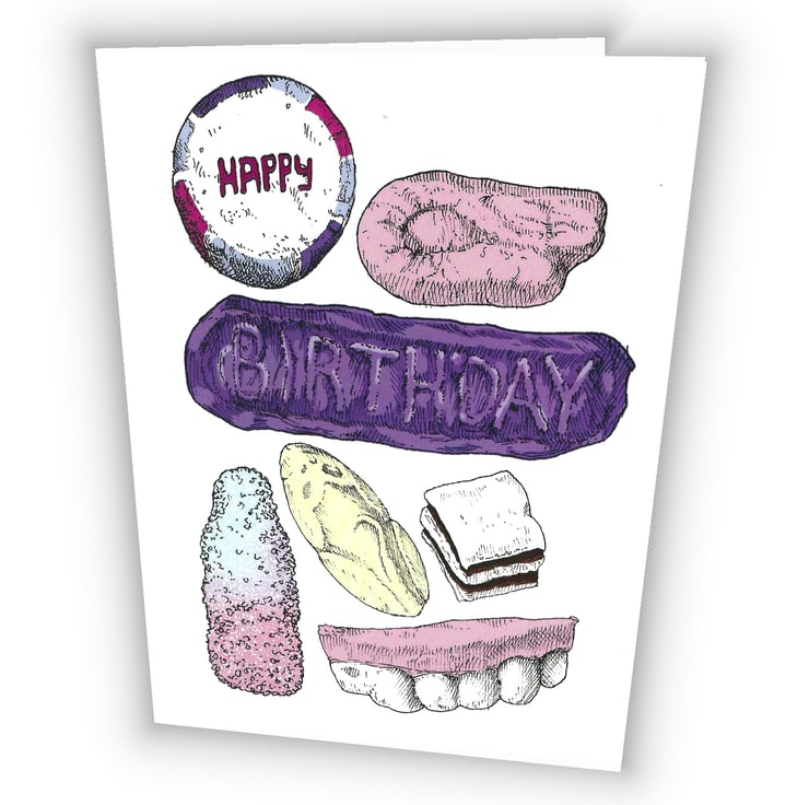 Great for anyone with a sweet tooth, here’s a fun and nostalgic greetings card with some classic English sweetshop favourites put together with a “happy birthday” message on the front. Using illustrations by Simon Lewis, these detailed drawings have been coloured in digitally to give a bright and humourous birthday message for anybody with sweet childhood memories. It features a number of national favourites such as the shrimp, bubblegum bottle, white mice, wine gums and teeth among others.