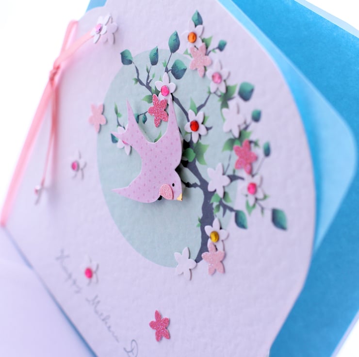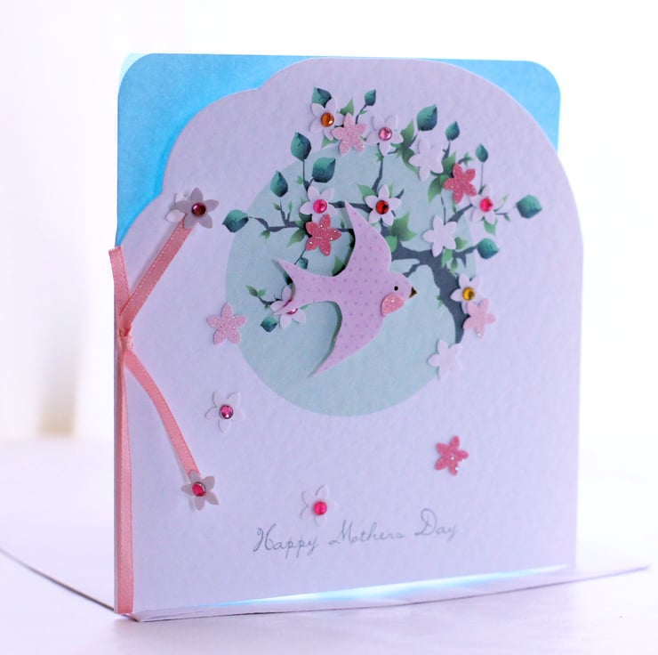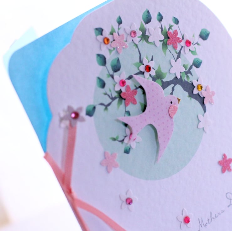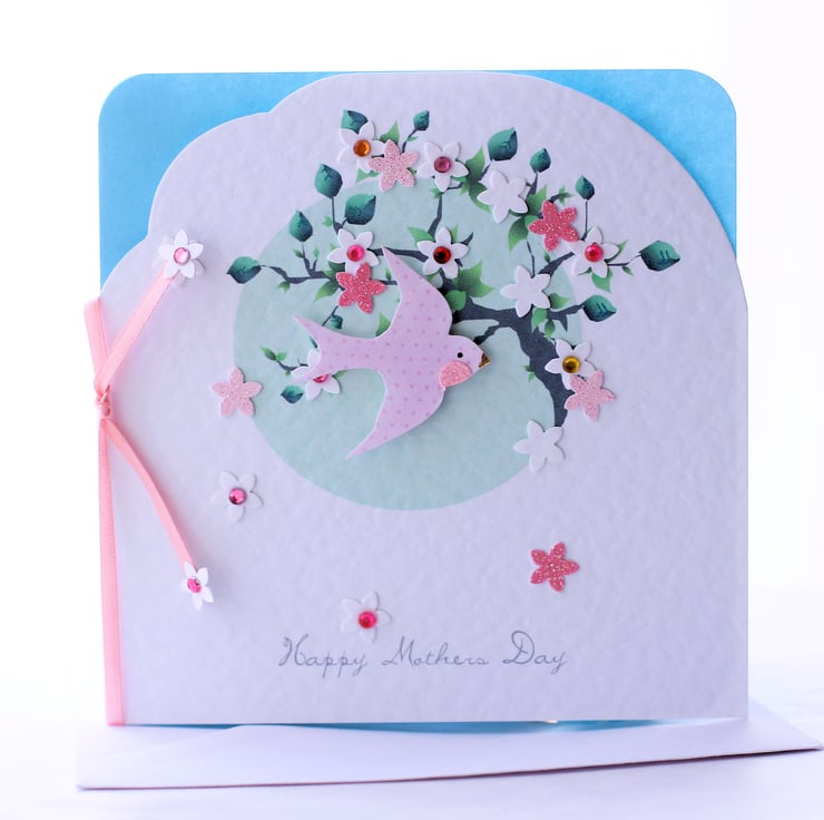 Perfect for wishing your Mum a very special day, this pretty spring themed card featuring a swallow flying through sparkling pink and white blossom's is a reworking of our popular 'Blossom' Birthday Card and has been redesigned especially for Mothers Day... xx