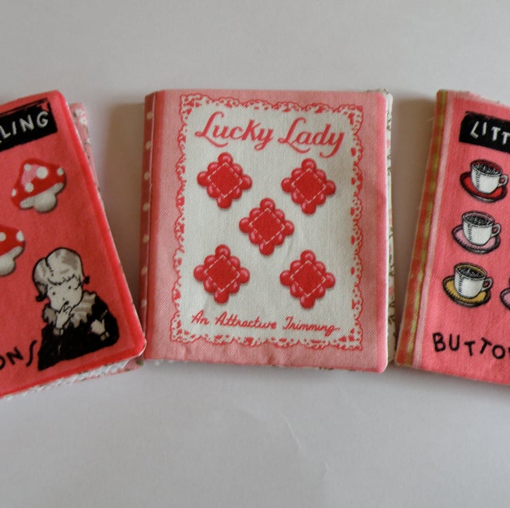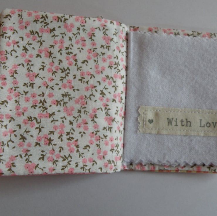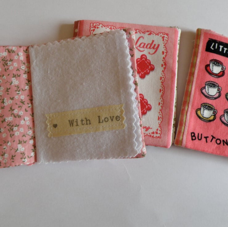 This listing is for a pretty little retro style needle case. Each case has been made in the style of a book. The front book covers depict buttons and and the backs are made with coordinating spotty or gingham fabric. The inside covers have been made using cotton fabric with a tiny flower print. There are four pages of soft brushed cotton ideal for housing your needles , pins and safety pins. The front page of the book has been embellished with a "with love" message.