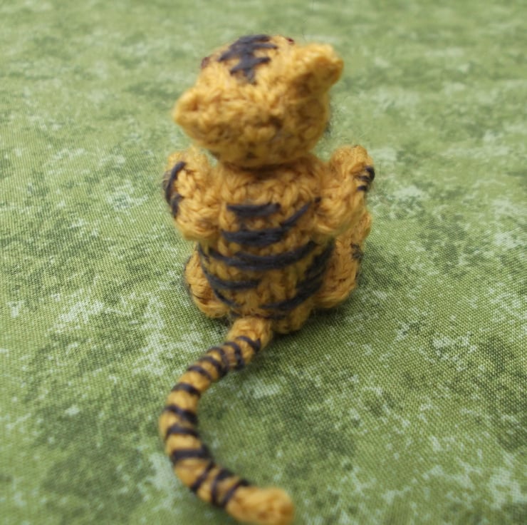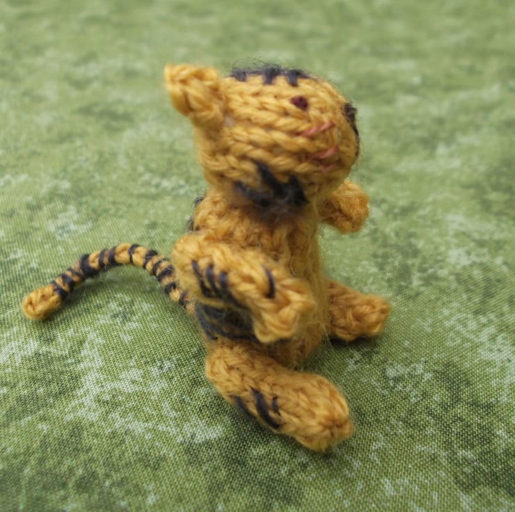 Knitted tiger. Knitted with good quality 100% wool yarn and stuffed with wool fleece. It is 5 cm in sitting height.