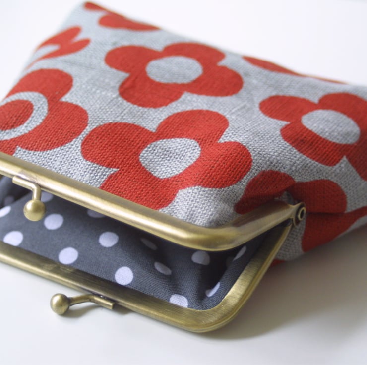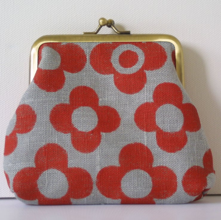 Grey linen purse in my own Mod Flower design which has been screenprinted in beautiful Cranberry red