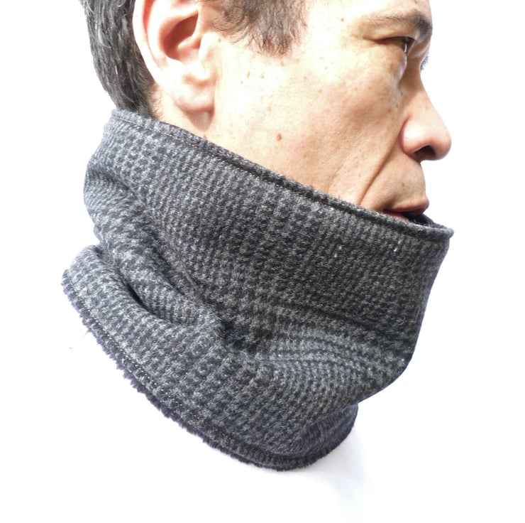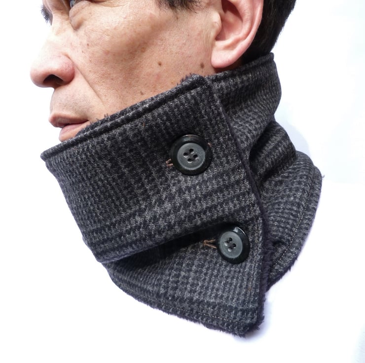Stunning mens neckwarmer handmade from this superb quality wool plaid fabric in a gorgeous black/gray combination. For snugglyness the neckwarmer is fully lined with a black fleece fabric. The neckwarmer fastens with 2 coordinating buttons.