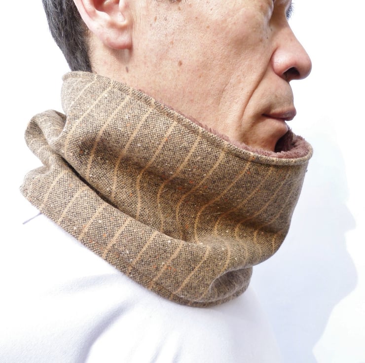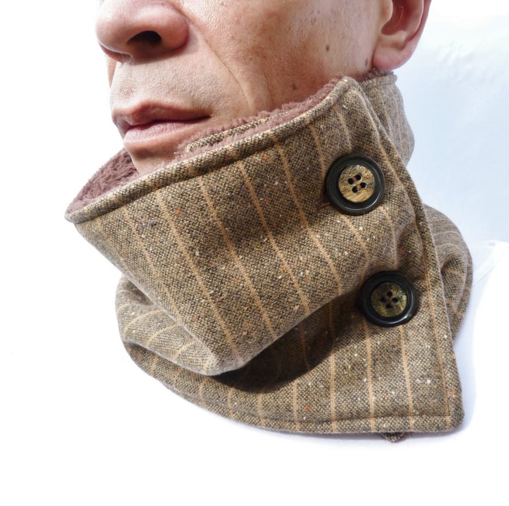 Stunning mens neckwarmer handmade from this superb quality brown/beige Italian wool tweed fabric. For snugglyness the neckwarmer is fully lined with a super soft brown fleece fabric. The neckwarmer fastens with 2 coordinating bark buttons.