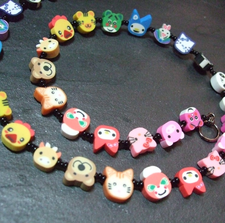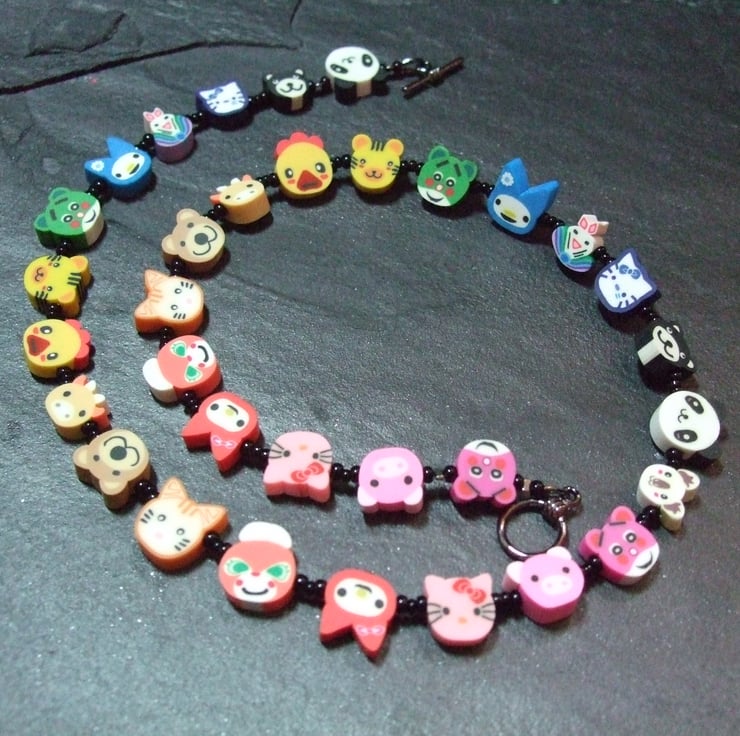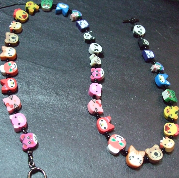 A cute, whimsical adult version of our popular children's necklace from the Kitsch Creations Animal Magic Collection, this item is lovingly constructed using miniature animal-themed polymer clay canes carefully placed in a rainbow configuration, off-set to dramatic effect with the simplest black seed beads and high quality black plated metal jewellery findings. The adorable animal canes used in this vibrant design are bound to attract attention! Please note that occasionally different animal heads may have to be substituted.