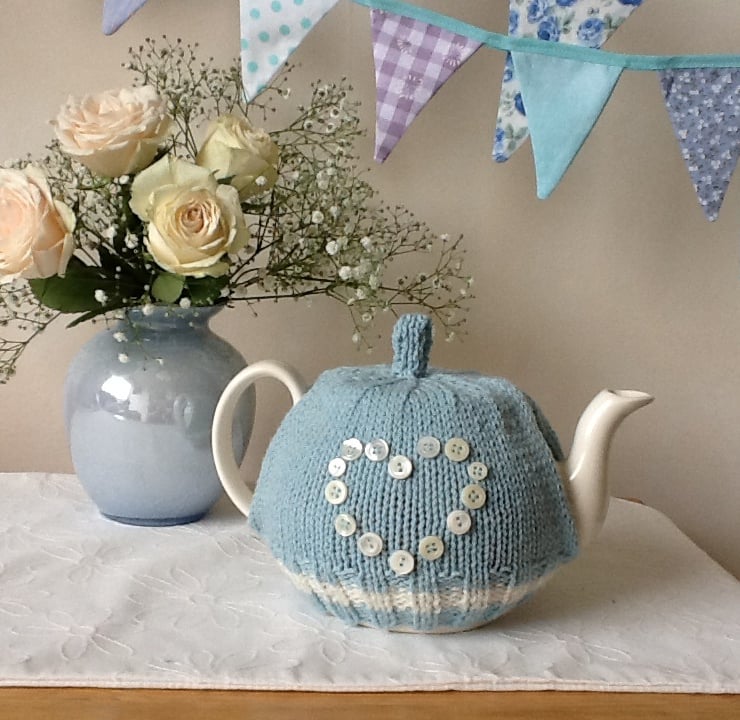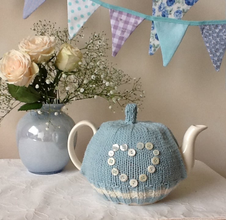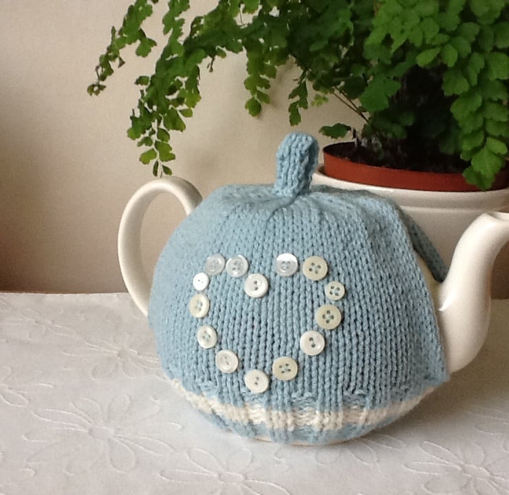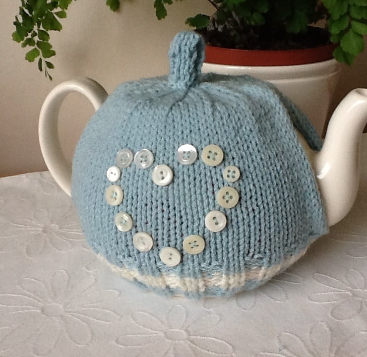 A duck egg tea cosy with my exclusive button heart design. It is designed to fit upto and including a 4 cup pot. It is made from a wool/acrylic mix, this allows it to be machine washed, and tumble dried on a cool seting, though, I would generally recommend handwashing to keep it better in a better shape. I have several other designs available (please see my other auctions). If you want a different colour please feel free to contact me, and I can try and help.