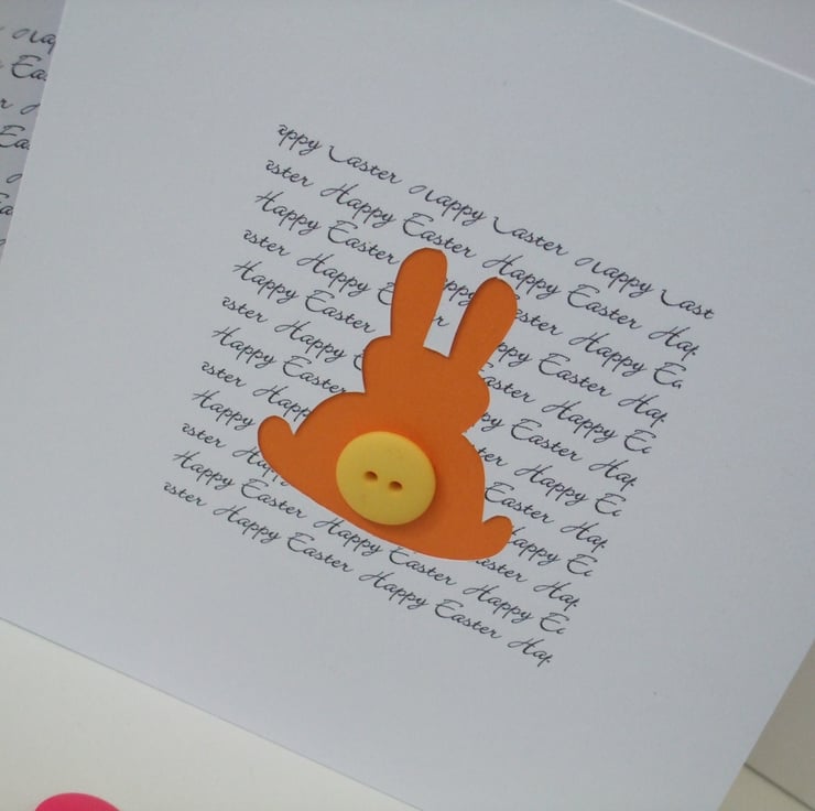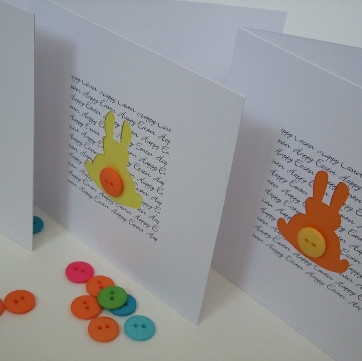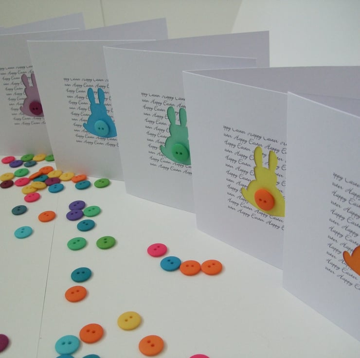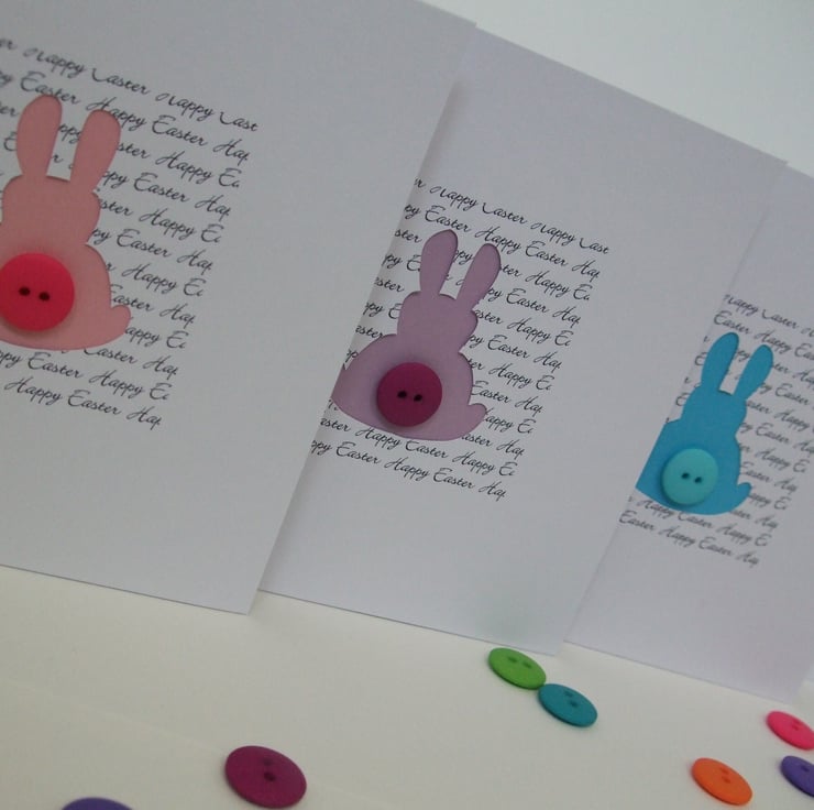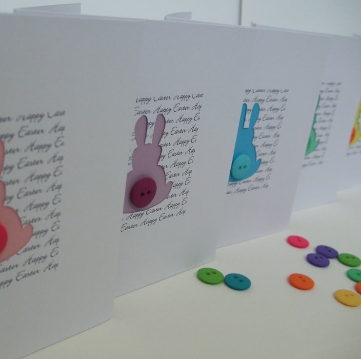 These cute little Easter bunnies with button tails make a fun Easter card for a loved one. The rabbit shape has been cut out by hand and coloured card has bee behind it.