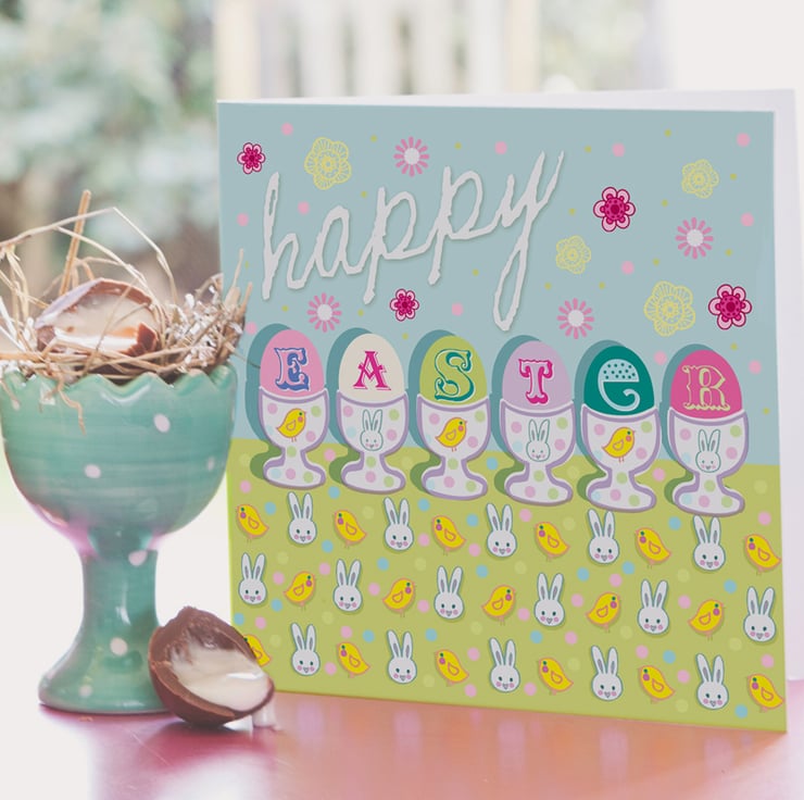 'Happy Easter' card. 15cm x15cm printed onto FSC, 280gsm card using very high quality digital colour printing with a silk finish ensuring the colours are vibrant. Blank inside for your own message, this card comes with a white diamond fold envelope and cello bag to protect it.