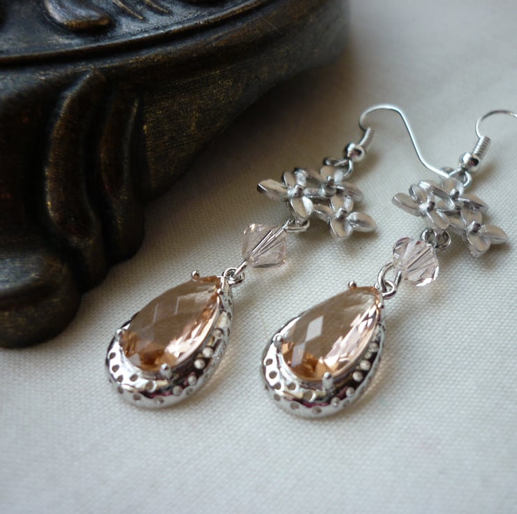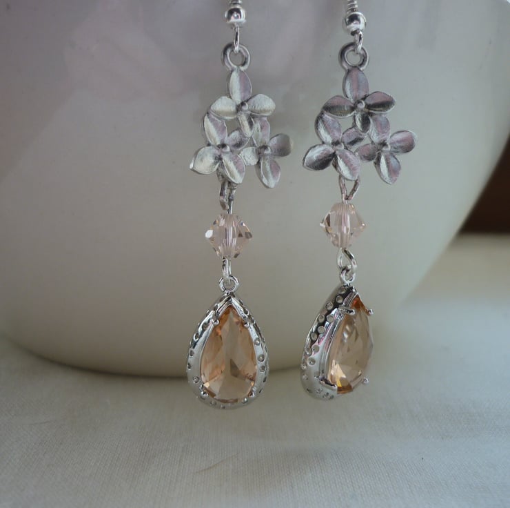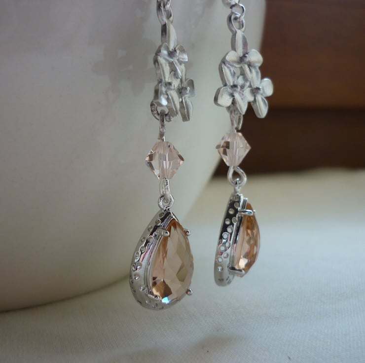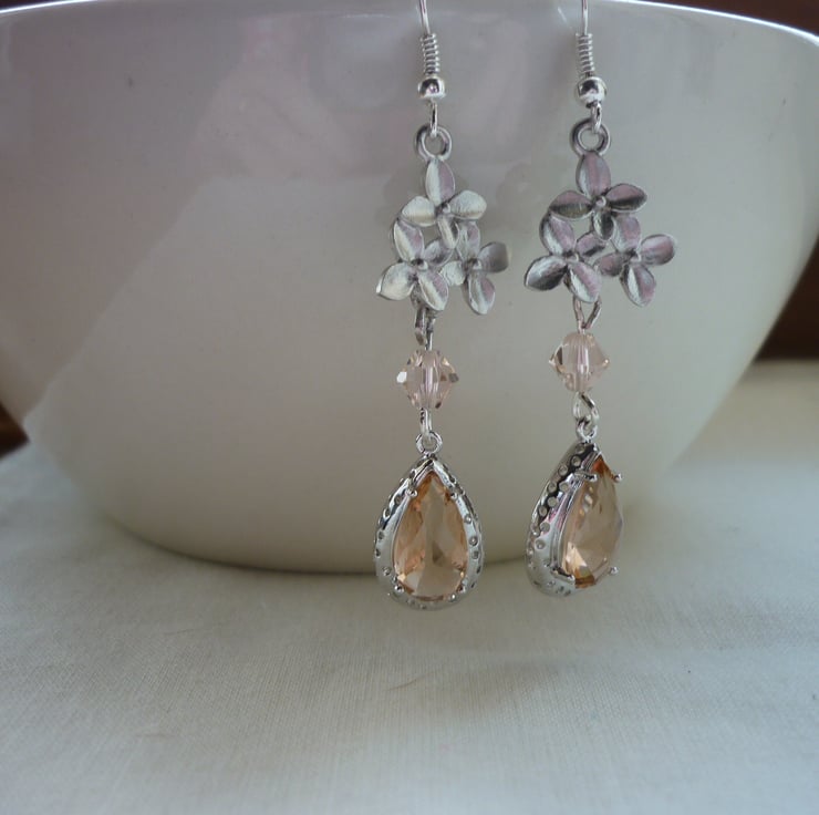 THE EARRINGS HAVE BEEN MADE WITH FANCY SILVER PLATED FRAMED GLASS TEARDROP SHAPED BEADS IN FACETED PEACH, SILK COLOURED SWAROVSKI BICONE CRYSTALS , SILVER PLATED CHERRY BLOSSOM EARRING CONNECTORS AND FINISHED WITH SILVER PLATED NICKLE FREE EAR WIRES.