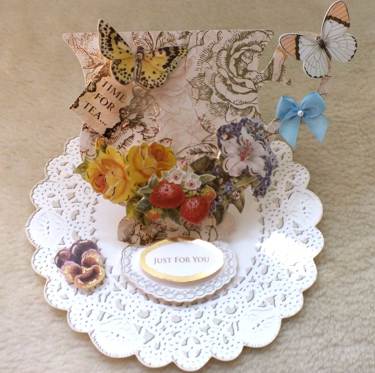 A delightful tea cup, easel style card, ideal for Mother's Day or a Birthday. It's decoupaged with colourful flowers and butterflies on a gold foil accented ivory tea cup. The sentiment on the faux doily says 'Just For You'. Plus there is a little tag at the top left of the tea cup which says 'Time for Tea'. It measures approx. 5 x 5", and folds flat to fit the envelope. There is space for your own message on the reverse of the doily/card base.