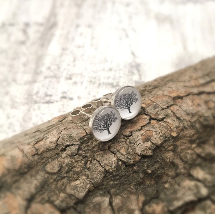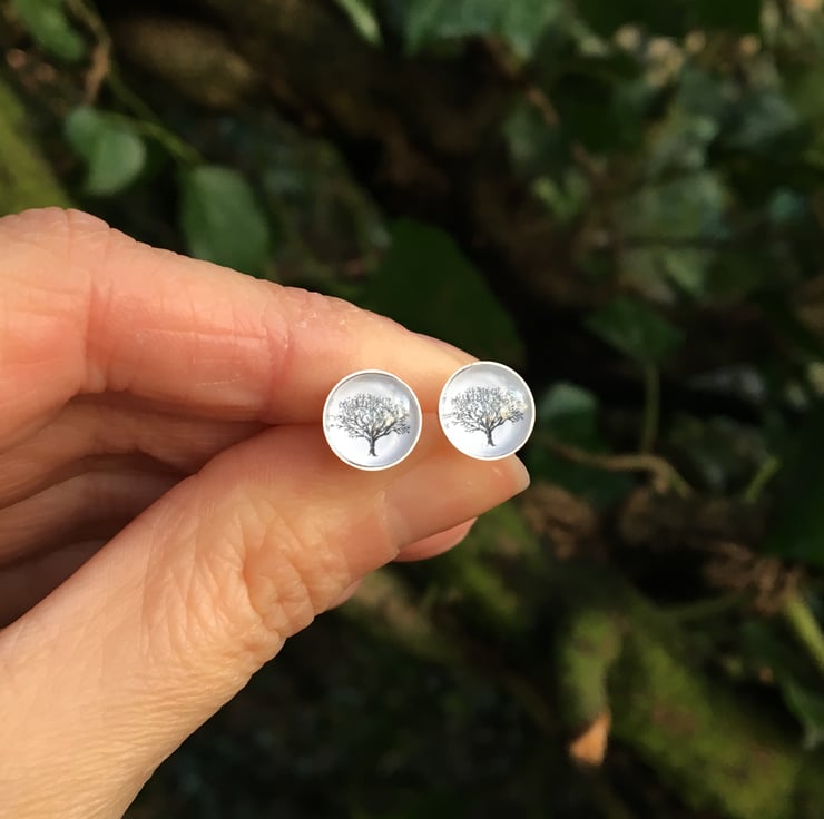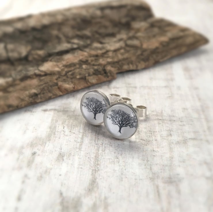 Pretty little graceful altered art stud earrings featuring a black and white tree illustration in gorgeous sterling silver posts. They have a lovely organic, woodland feel to them.