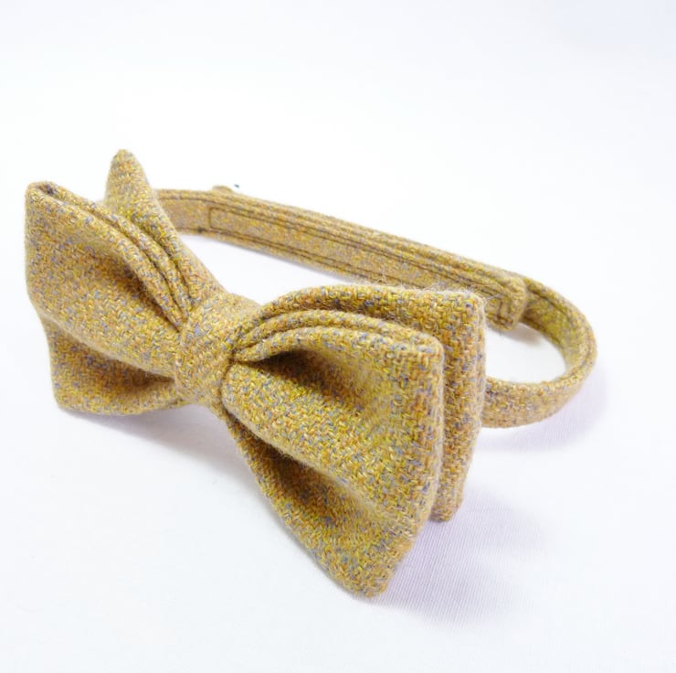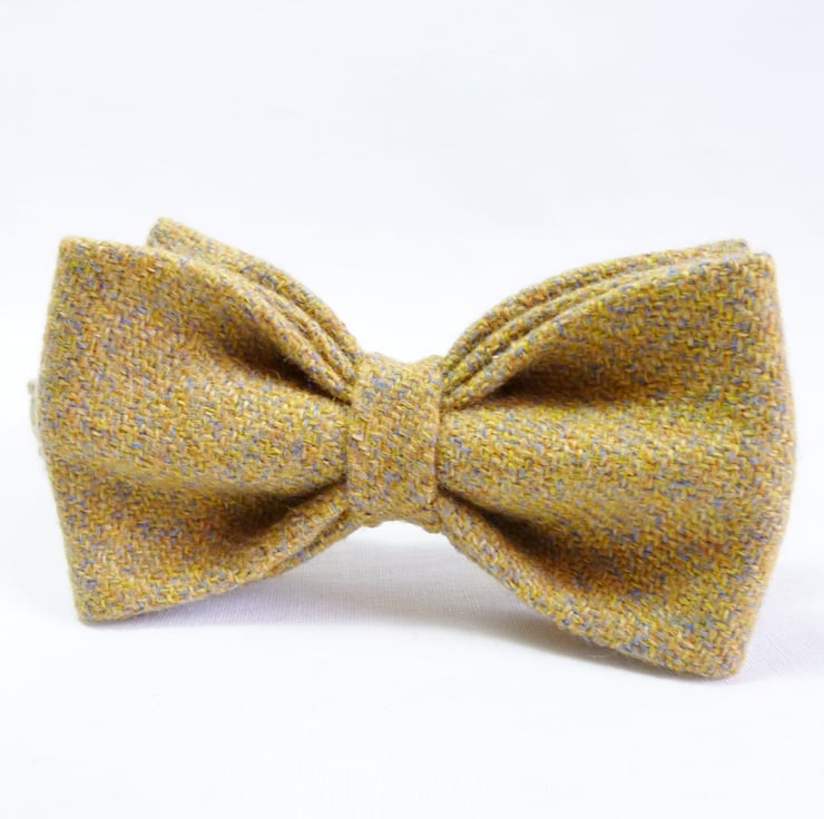 Bow ties are cool, fact. A super awesome mens accessory handmade from the finest Irish tweed fabric in mustard yellow. Unlike most pretied bows this tie features a double bow and gives a true impression of a one piece bow tie. A simple velcro fastening makes it incredibly easy to fit and wear.