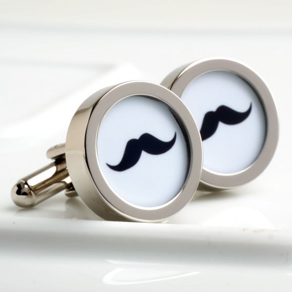 Big white mustache cufflinks with a black background, can also made with a white background or made in your choice of colour (for instance in your wedding colours).