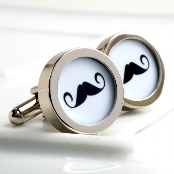 Curly black moustache cufflinks with a white background, can also made with a black background or made in your choice of colour (for instance in your wedding colours).