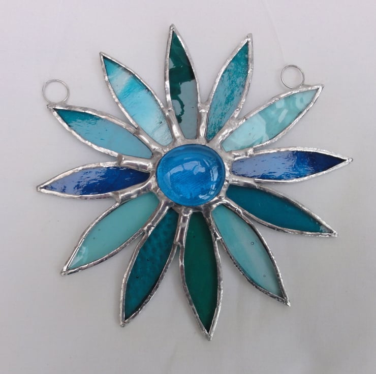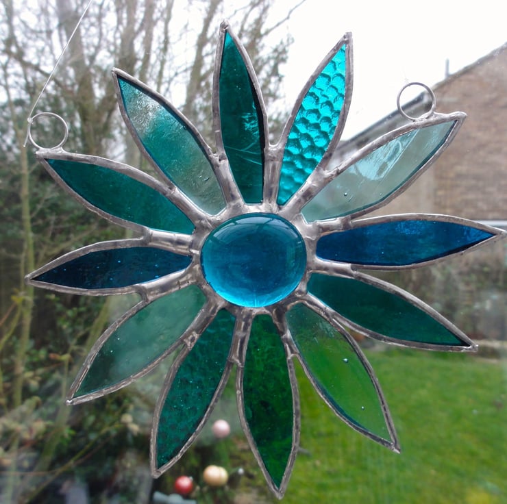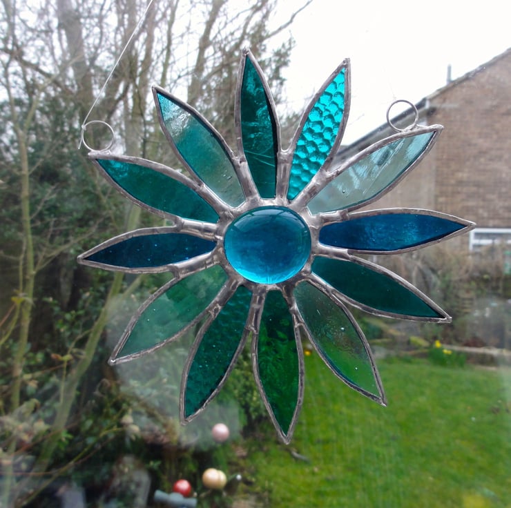 The daisy has been made from a mixture of six types of turquoise glass, each piece of glass has been copper foiled and soldered together with a large turquoise blue glass nugget in the middle. Two rings and a length of fishing line has been attached for hanging purposes.