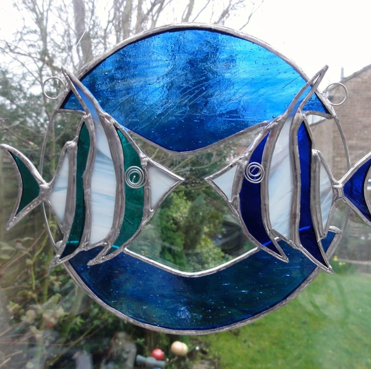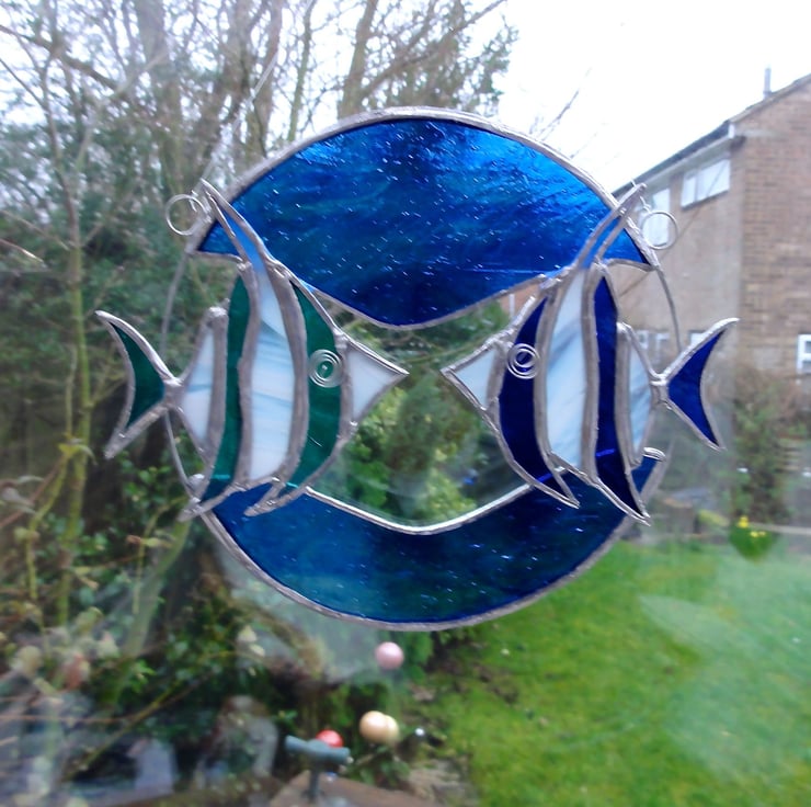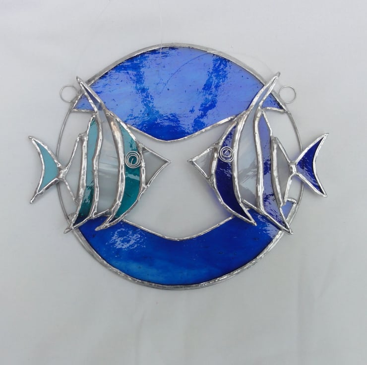 Two angel fish made from cobalt blue and streaky white glass and turquoise and streaky white glass are shown in a wire circle with streaky blue glass for the sea. Each fish measures 9 cms x 10 cms, the circle is approx 16 cmd in diameter but overall measures 19 cms x 16 cms.