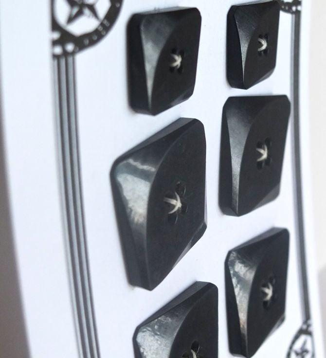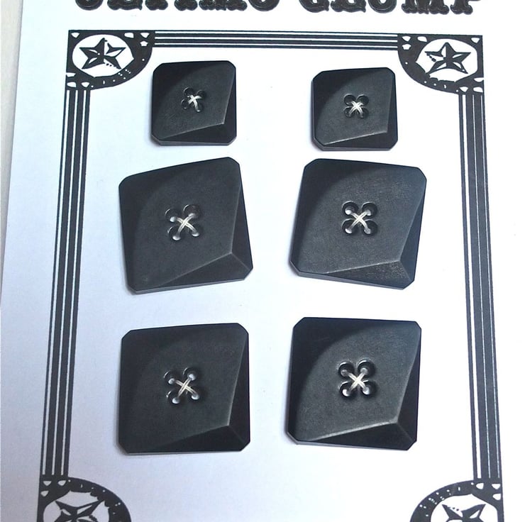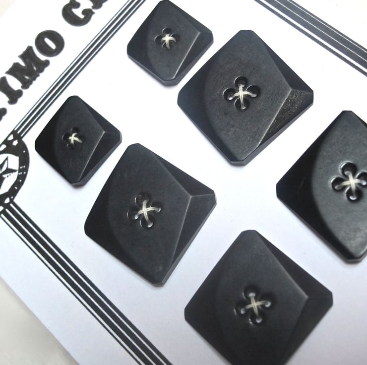 6 Vintage Square Black Buttons, 2 x 18 mm and 4 x 26mm, they have bevelled corners.