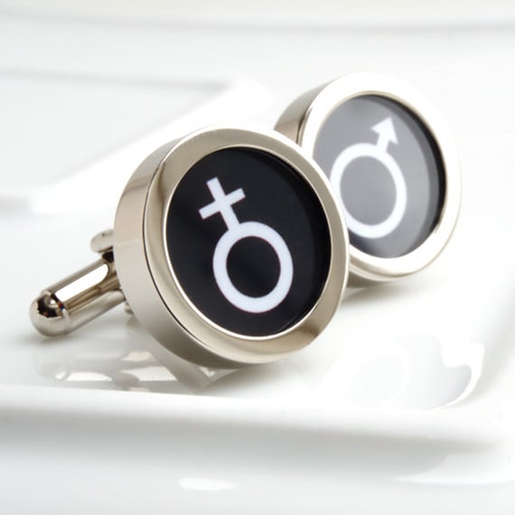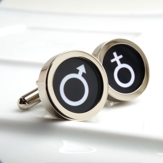 Men and women symbol cufflinks with white symbol on a black background.