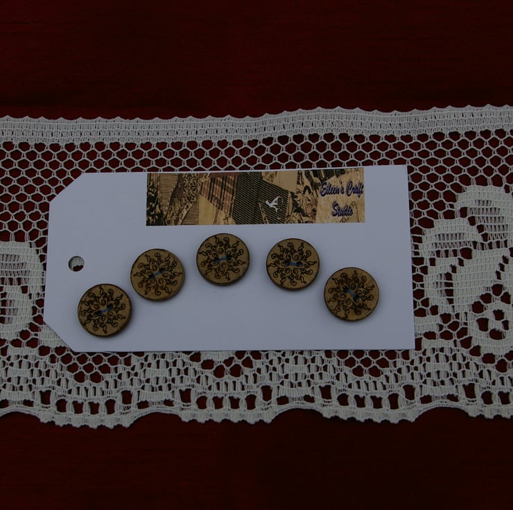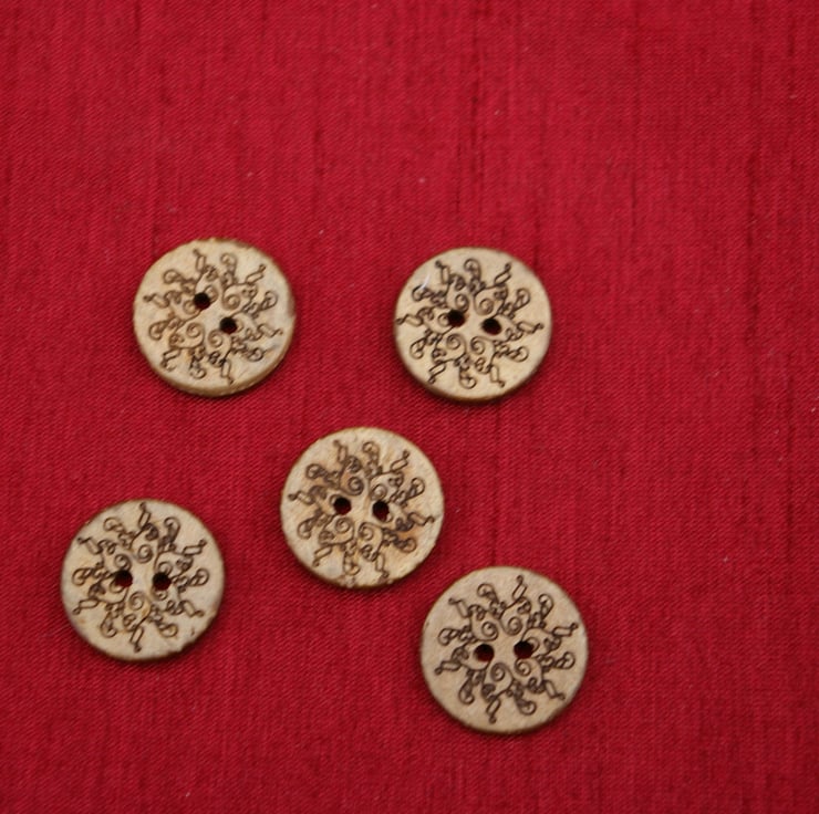 A set of 5 pattern buttons made from coconut shell. They are a two hole button and can be used in many different crafting projects.