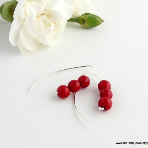 Three deep red coral beads are stacked together on a simple, classic sterling silver almond ear wire.